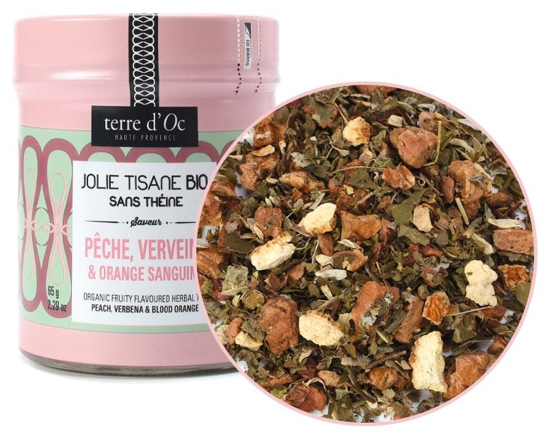 Apfelstückchen*, Blätter von wildem Brombeerstrauch*, Eisenkraut*, natürliche Pfirsicharomen*, natürliche Blutorangenaromen*, Amarante*, Kornblume*. * aus biologischem Anbau