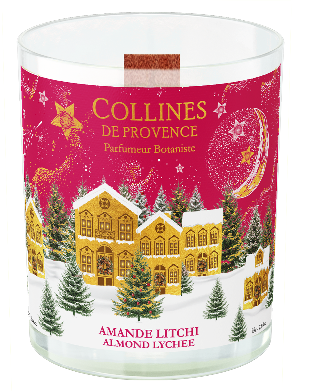 Genießen Sie eine festliche Weihnachtsatmosphäre mit der Duftkerze Mandel-Litschi von Collines!