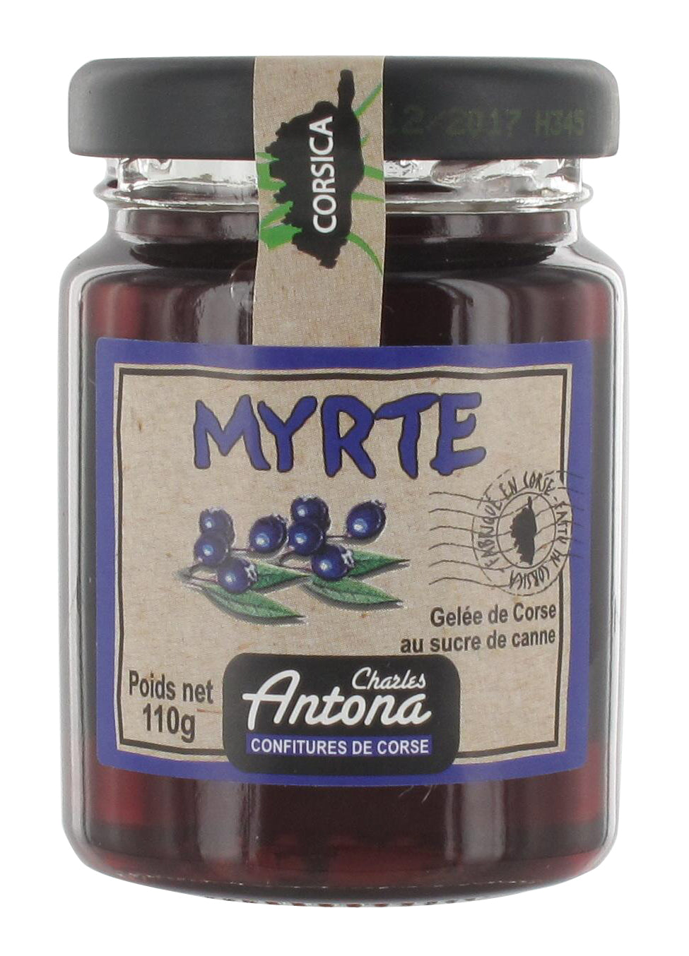 Myrtensaft, 39% Rohrzucker, Glukosesirup, Geliermittel: Fruchtpektin, Zitrussaft, Säurungsmittel: Zitrussäure