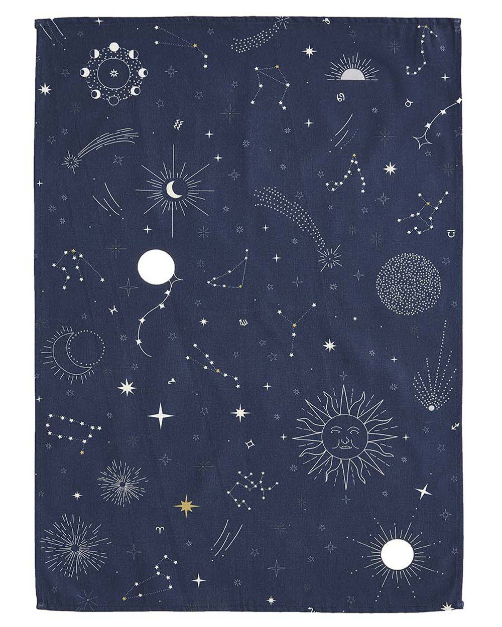 Bestaunen Sie mit uns die Sterne! In dieser Nacht scheinen Sternbilder fröhlich zu kreisen, während ihre leuchtenden Motive auf tiefblauem Hintergrund die Szenerie zum Leben erwecken. Mond, Sonne, Sternschnuppen – alles ist dabei. Das funkelnde Highlight dieses lebendigen Himmels ist der sanft vergoldete Polarstern, der mit seiner strahlenden Präsenz beeindruckt – ein perfekter Begleiter für Träumer und Hobbyastronomen.