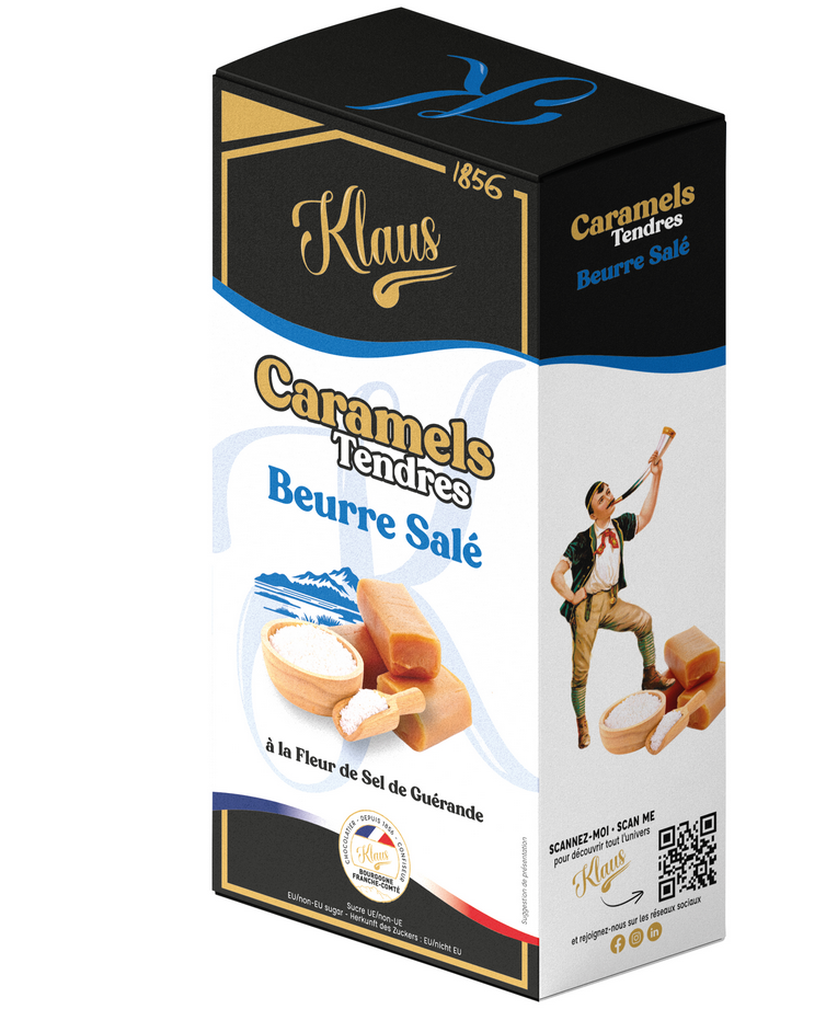 Im Jahre 1856 gründete Jacques Klaus die “Chocolaterie-Confiserie Klaus“. Er ließ sich im Franche-Comté, einer Region im Osten Frankreichs inmitten von Weideland nieder, um immer leicht an frische Milch zu kommen, die für die Produktion seiner Karamelbonbons unerlässlich ist. Fast anderthalb Jahrhunderte später, lebt diese Tradition weiter, und der Wille Qualitätsprodukte herzustellen, ist der Gleiche geblieben. Die Karamelbonbons werden aus edlen Zutaten, wie frischer Butter und Milch, in Kupferkesseln, nach einem traditionellen, streng geheimen Rezept, hergestellt. Der Firmensitz befindet sich heute in Morteau, im Département Doubs in der Region Bourgogne-Franche-Comté. • Herstelleranschrift: Chocolat Klaus, 3 rue Victor Hugo, 25500 Morteau, Frankreich •