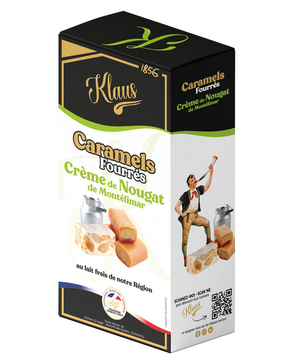 Im Jahre 1856 gründete Jacques Klaus die “Chocolaterie-Confiserie Klaus“. Er ließ sich im Franche-Comté, einer Region im Osten Frankreichs inmitten von Weideland nieder, um immer leicht an frische Milch zu kommen, die für die Produktion seiner Karamelbonbons unerlässlich ist. Fast anderthalb Jahrhunderte später, lebt diese Tradition weiter, und der Wille Qualitätsprodukte herzustellen, ist der Gleiche geblieben. Die Karamelbonbons werden aus edlen Zutaten, wie frischer Butter und Milch, in Kupferkesseln, nach einem traditionellen, streng geheimen Rezept, hergestellt. Der Firmensitz befindet sich heute in Morteau, im Département Doubs in der Region Bourgogne-Franche-Comté. • Herstelleranschrift: Chocolat Klaus, 3 rue Victor Hugo, 25500 Morteau, Frankreich •
