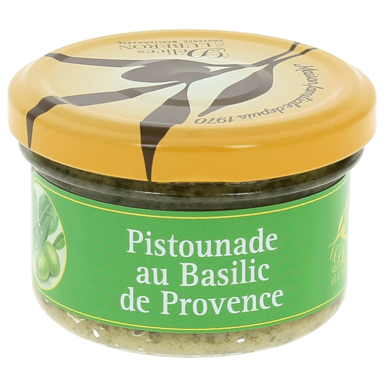 Grüne Oliven, Basilikum aus der Provence 18%, Sonnenblumenöl, Olivenöl, Knoblauch, Essig, Salz, Pfeffer. Ohne Konservierungsstoffe.