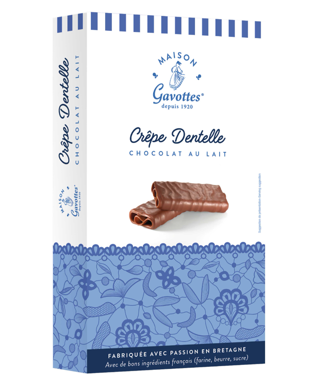 Die berühmte Crêpe Dentelle Gavottes®, bekannt für ihre zarte Knusprigkeit, verdankt ihre Entstehung einem glücklichen Missgeschick. Im Jahr 1886 ließ Marie-Catherine Cornic eine Crêpe einen Moment zu lange auf dem Feuer. Um sie dennoch zu retten, faltete und rollte sie sie ein – und entdeckte dabei ein Gebäck, das außergewöhnlich leicht und knusprig war. So wurde die Crêpe Dentelle Gavottes® geboren. Ihr Geheimnis? Eine hauchdünne Crêpe, die achtmal um sich selbst gewickelt wird, kombiniert mit traditioneller Handwerkskunst und einem einfachen, aber raffinierten Rezept aus sorgfältig ausgewählten Zutaten. Ein Genuss, der bis heute begeistert!